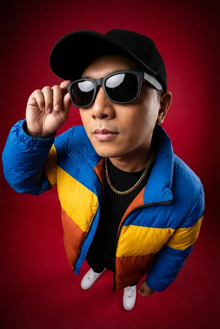 Convert uploaded photo into an ultra-wide 10mm fisheye portrait shot from an extreme high top-down angle, creating strong perspective distortion (slightly enlarged head, naturally compressed body proportions, realistic lens curvature). Subject wearing oversized matte black sunglasses and a plain black cap. Left hand subtly adjusting the sunglasses, confident upward gaze toward camera, calm but dominant expression. Outfit: bold color-block puffer jacket (electric blue, vibrant yellow, burnt orange panels), fitted black tee underneath, thick gold chain necklace, clean white sneakers. Street-luxury styling. Background: bold deep red studio backdrop with smooth gradient falloff, subtle vignette, seamless cyclorama feel. Lighting: sharp high-contrast editorial lighting, strong key light from upper front, subtle rim light separating subject from background, glossy highlights on sunglasses, cinematic shadow depth. Ultra-detailed skin texture, realistic fabric folds, natural light reflections, crisp focus, fashion magazine editorial look, hyper-real clarity, 8K resolution, dramatic, powerful, modern street icon energy. ar-9:16